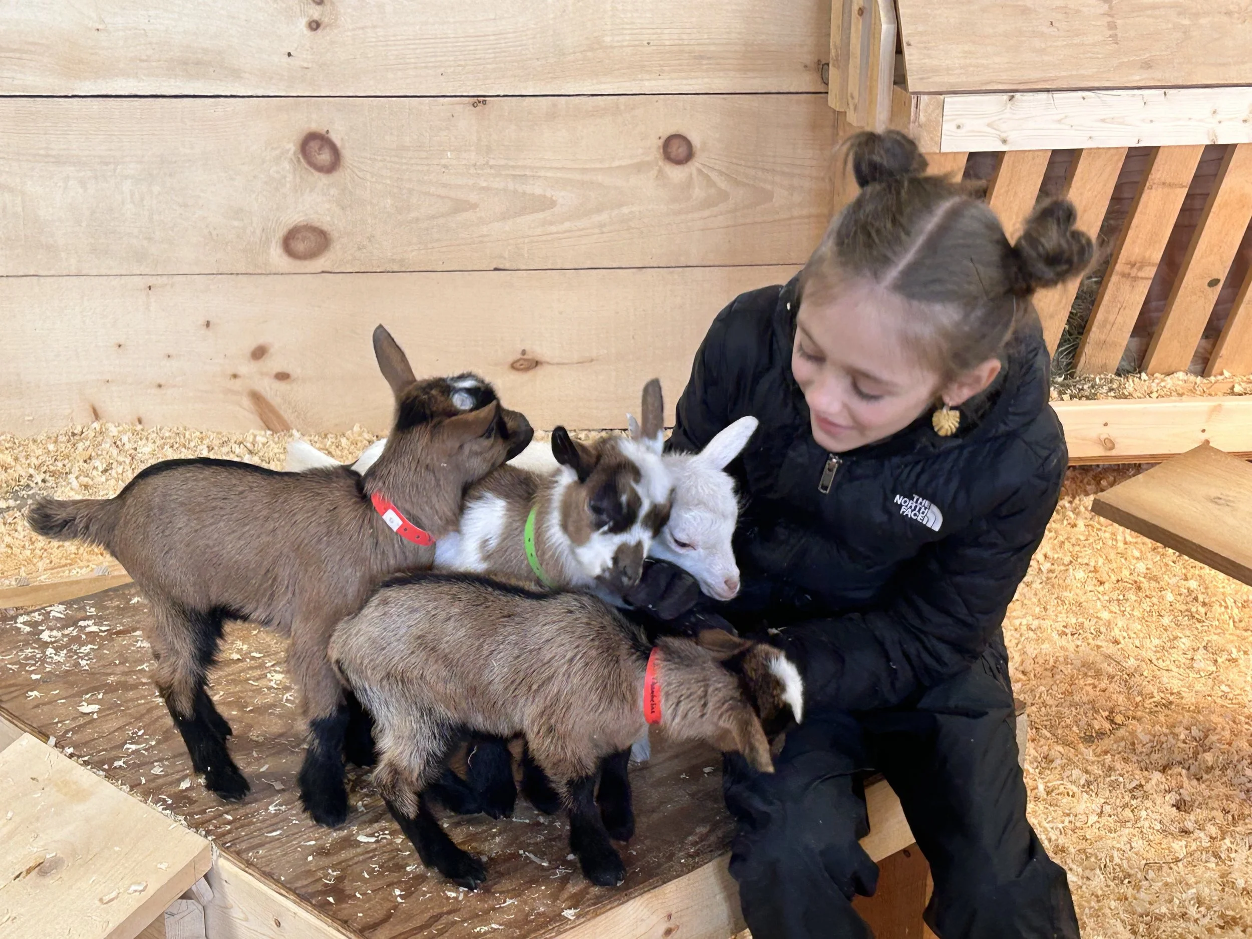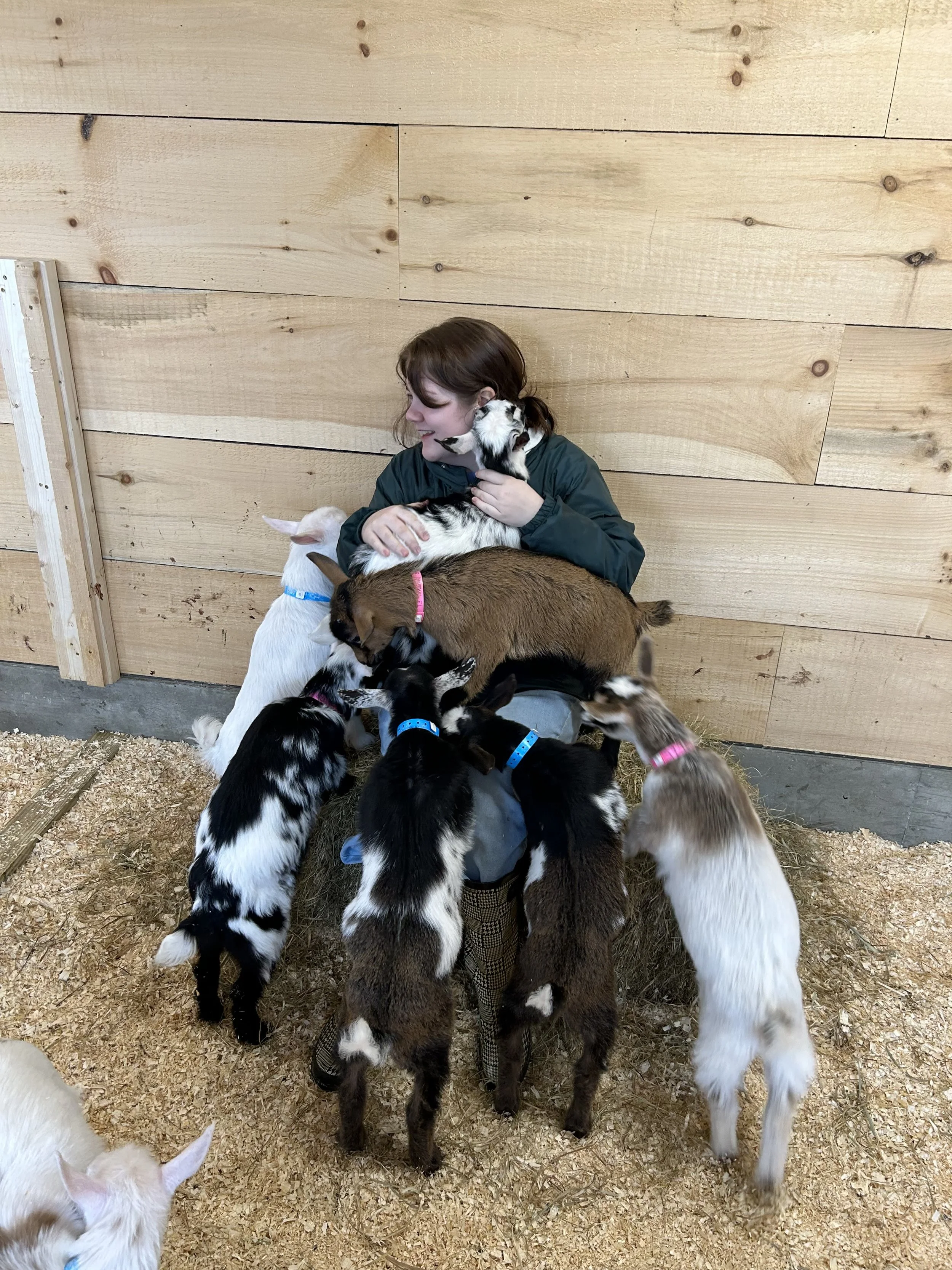 During your time on the farm, you will have open access to the goat kids, which will range between 1 week - 8 weeks old. Be prepared to get down and dirty….most people enjoy sitting on the floor and letting the goats climb in their lap. No dangling jewelry allowed and I highly recommend those with long hair wear it pulled up (not responsible for accidental haircuts!)
